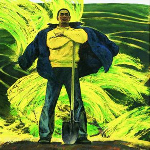 《潮》这幅作品由詹建俊创作于1984年。画面重点表现了一位新时代的农民,他手扶铁锹,昂首挺立,自信而豪迈地站在绿潮涌动、充满着希望的田野上;被风掀起的大衣弧线与身后绿潮的旋涡形成对应;简洁而富有强烈视觉对比的颜色营造出热烈明亮的色彩氛围。画家以浪漫主义的情怀描绘了改革开放后农民的新面貌,舞动的外衣、矗立的铁锨、周围飞动的风潮与主体人物的内心憧憬形成一种意向性的表述,暗示了一代中国人在新时期充满渴望的雄心壮志。这幅作品也被誉为“上世纪80年代中国改革开放的缩影”,荣获第六届全国美展金奖。