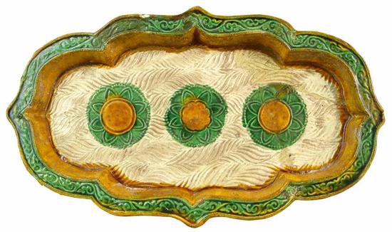 盘分为三种形制,有圆盘、四方盘、花口盘。圆盘的装饰为内底心压印纹饰,内壁涂彩,外壁施透明釉;方盘与花口盘来源于木质或者金属器造型,底心压印四出菊花纹,黄花绿叶,甚是美观,四壁竖线分割布局,间饰有蔓草纹或小菊花,色彩质感强烈。