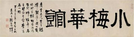张廷济隶书结构方正、运笔沉实,朴拙中寓秀逸,宽博挺拔,自开面貌。其妙能熔汉、魏、晋、唐之隶法于一炉。如其七十六岁时为吴彦宣所书的“小梅花馆”匾额,端庄典雅,清穆有韵。“小”字有篆意平直不板。“馆”字有晋隶之意趣,疏朗自然。“花”字又颇俱楷法,其长横呈弧形,粗壮的竖笔与其它细笔对比,有相避相形,相呼相应之趣。各体融通也为张廷济隶书特色