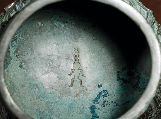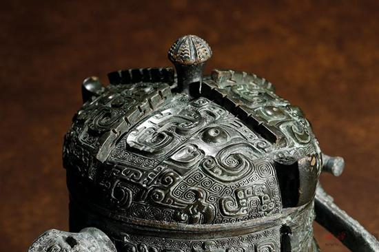 整器纹饰精美,采用“三层花”工艺满布,高低错落,疏密结合。瓜棱钮每一办上作头下尾上的蝉纹。商代蝉的形象不刻画翅翼,有处于复育阶段的幼虫和成虫两种形式,盛行于商末周初。由于蝉纹长方形,横竖都可安置,多作为辅助纹饰,如鼎的腹部多竖式,有的在外部加三角形图案,又称三角蝉纹。在觚的脰部、壶的圈足、卣的提梁多横式。在瓜棱钮上作幼体蝉竖式排列,较为少见。