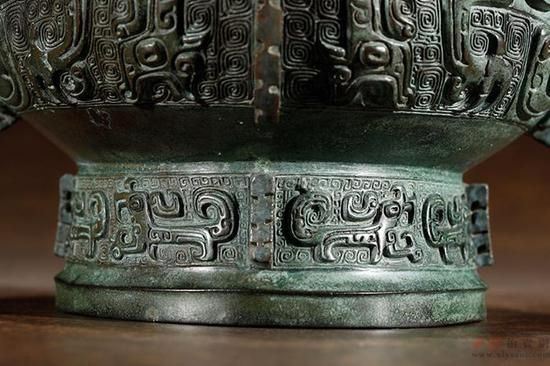 器身颈部两侧作短扉棱,与提梁一同作分隔线,其内对称装饰两两追随的弯角鸟纹。弯角鸟纹突目,角向下弯曲复又上翘,身躯修长,尾部上卷,两组勾弯,流行于商末周初。颈部间有横沟纹相隔。腹部出四条等距的扉棱,两条为鼻基线,两条为分隔线,布满外卷角型兽面纹。兽面双目甚大,椭圆凸出,“一” 字瞳仁。双角阴刻装饰,耳口起线勾勒外形。每个兽面两侧,置有头下尾上的弯角龙纹。高圈足出四条短扉棱,对称两组弯角鸟纹,与颈部遥相呼应。与之不同的是,圈足上的鸟纹眼睛趋于平面,周身纹饰较为舒缓,不及颈部凌厉。