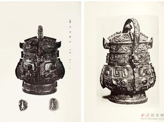 此青铜奚卣为金石大家罗振玉故藏,清代即已面世,铭文最早著录于吴大澂一八九三年自刻《字说》一书,罗氏代表作《梦郼草堂吉金图续编》录有其旧影。民国时流入日本,一九三二年出版在山中商会举办的《世界古美术展览会》图册内,并归东京冈村小林收藏。后复又在英国和美国辗转,分为伦敦埃斯卡纳齐、纽约罗讷尔德·劳德等现代藏家所有。自晚清至今,该器出版、著录二十余次,并在多国参与展览。