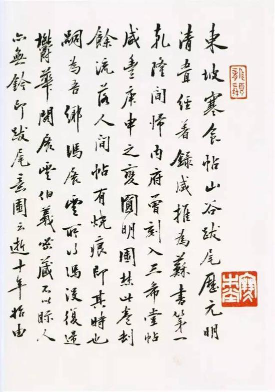 “东坡寒食帖,山谷跋尾,历元、明、清,迭经著录,咸推为苏书第一。乾隆间归内府,曾刻入三希堂帖。咸丰庚申之变,圆明园焚,此卷劫余,流落人间,帖有烧痕,即其时也。嗣为吾乡冯展云所得。冯没,复归郁华阁。展云、伯羲密藏,不以示人,亦无钤印跋尾……”