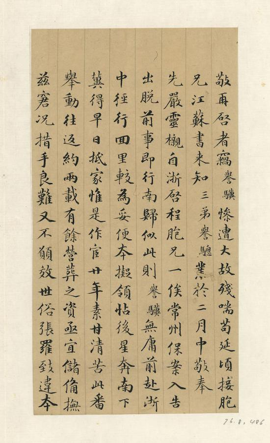 近读清代“高要冯展云中丞书牍”册页,内容于家常之外,颇牵涉史事,而似尚未有人研究。冯誉骥(1822—1883),字仲良,号展云,高要(今广东肇庆)人。道光二十四年进士,授翰林院编修,光绪五年授陕西巡抚,后为御史弹劾去官,侨居扬州。“平生廉洁。嗜书画,书法逼真欧阳率更,晚年效李北海;画仿石谷,秀润工致。世咸珍之。”
