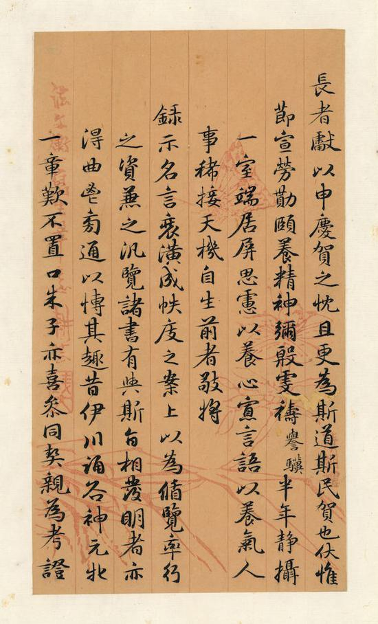 “舅祖大人屡赐钧言,藉谙道祉,比闻周巡沆豫,丕著勤劳,第颐养成宣,精神自卜加健,宅中事务得三表叔照料,一切自臻裕如也。”