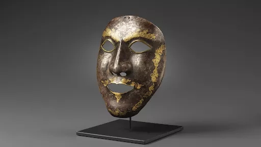这个异常罕见而又神秘精美的武备面具是仅有的两件来自西藏地区的已知实例之一,精巧锻铁而成,呈现人或神的面孔。在制作上大胆地使用鋄金装饰,眉毛和嘴周围有火焰状的卷须,并界定脸部轮廓。鋄金是一种特殊的金属加工技术,它是在铁的表面刻划细密的交叉线,然后将银丝或金丝打磨嵌入,以创造出精美的图案。在15世纪, 汉藏工匠将其提升到一个相当高度水平,用于装饰世俗和宗教用途的铁艺品。除了鋄金之外,此面具的眼睛开口处还镶有铜合金细条。嘴部开口处则围绕一条鋄金线,形成薄薄的上下唇。面具的正面有些部位金属表面较为明亮,特别是在脸颊和前额处,而其余部分则包浆浓厚深沉。我们已很难知道原来的表面是设计成银光闪闪的钢铁表面,还是特意呈现深色与鋄金装饰图案形成更好的对比。面具上有三对小孔,一对在顶部中心边缘,两对分在两侧,可能是为了固定面具而使用的带子。内侧为素面没有任何装饰。