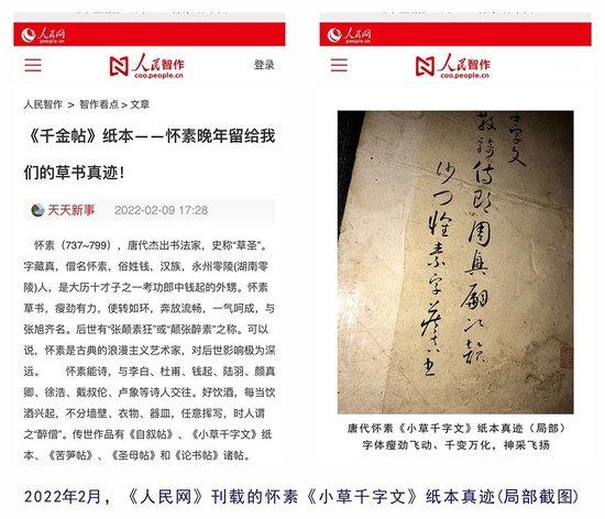 2022年2月,《人民网》刊载了“《千金帖》纸本——怀素晚年留给我们的草书真迹!”新闻,图文并茂展示了怀素《小草千字文》纸本真迹。