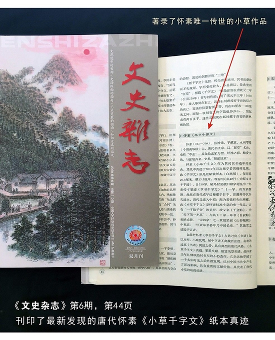 2020年11月,《文史杂志》第6期刊印了“历代名家《草书千字文》述略”一文,在“怀素《草书千字文》”著录中(第44页),刊载了怀素《小草千字文》纸本真迹的发现和递藏经过,内容如下: