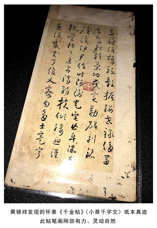 2017年5月,《网易》新闻率先刊载了“怀素真迹《草书千字文》面世,震惊中外”一文而轰动业界,指出黄锦祥发现的怀素小草“纸本”真迹别开生面,颇有“二王”之风,用笔瘦劲挺拔,通篇神采飞扬。