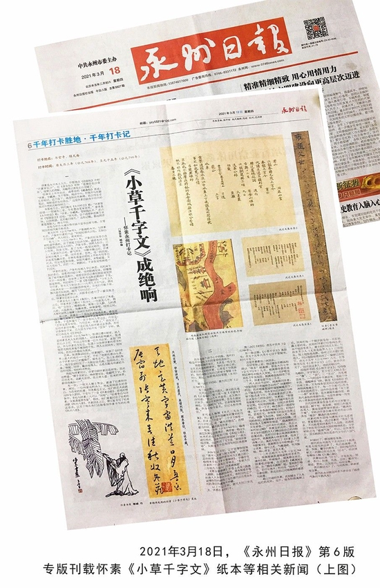 2021年10月,湖南人民出版社正式出版发行《千年打卡记》一书,全书记述了31位历史名人与永州的故事(共28篇,含虞舜、元结、李白、怀素、柳宗元、周敦颐、欧阳修、黄庭坚、王船山等人)。其中第11篇专版著录了“怀素《小草千字文》成绝响——怀素永州打卡记”一文,在书中第139页刊载了黄锦祥发现的怀素《小草千字文》纸本真迹(下图),又在第140页详述了“纸本”小草真迹的书法特点,充分体现出怀素在其家乡永州的巨大影响力。文中指出,这件作品写于永州(古称零陵),有着“天下第一小草”的美誉,是怀素唯一传世的小草真迹和他的笔墨绝响。