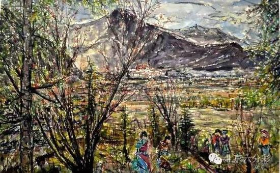 西藏圣景图》其特点是以中国画的传统水墨与西方油画的色彩相融的艺术表现手法。此作不仅仅表现了当下西藏的风景面貌,也呈现出藏传佛教的宗教精神,同时充分表现了圣城的圣景!