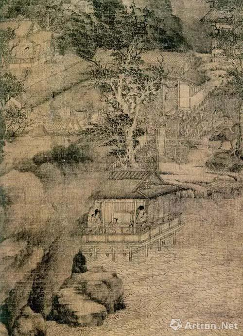 画中还可看到其他身影:一位着蓑衣草笠,正赶回山庄。河畔一童子骑牛,则正前往一竹篱环绕的院落。院中有一女子正在备饭,另一女子则荷食行于廊下。院后还可隐见居室,主人一家则聚于溪岸亭内,恰似隐喻乱世中一个安全的避风港湾。