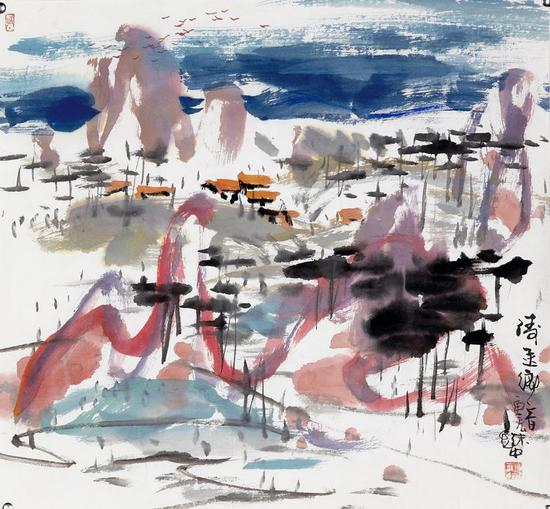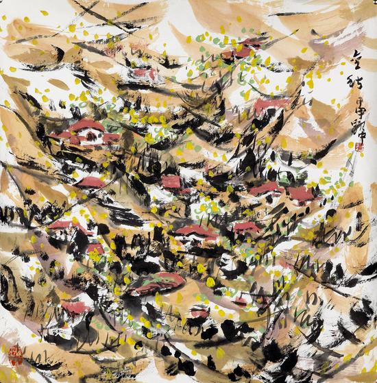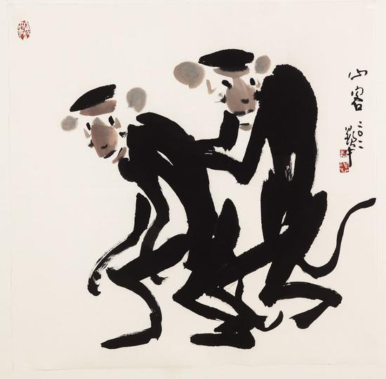 我们很难把郭显中作品简单归入中国传统国画一类,但是可以非常明确的是他的根在中国传统文化之中,他的国画是具有中国传统书画的基因和根性的。值得关注的是,他对墨画有独到而理性的认识。他说:“故墨画,在千百年前一出现就成为了超越时代的超前艺术。”他并不是机械般的仿古、复古,他的艺术实践努力运用中国传统的点线书写与墨色变化来进行空间结构与形象塑造。但是,我想强调的是,郭显中先生在国画创作中敢于进行既“破形”又“造形”的尝试。“破形”,即是他不拘泥国画传统中的固有形式、模式和方法,敢于改变甚至突破之。这使他的山水画有别于他人的山水画——其实这是一种艺术语言和范式的改变。“造形”,则是根据自己的情感、精神及观念意识的需要对描绘对象进行独特的再造和创新,画出“我之山水”。因此他认为墨画具有丰富而精彩的特质,可以创造感觉的、印象的、自由的艺术形式。在这一点上,他与西方的绘画又是相通的。显然,喜欢墨画的他并不“墨守成规”。他的画作,你可以看到印象派、点彩艺术的影响,甚至还有抽象艺术的融合,但很自然,骨子里还是显出了他所理解的中国精神和中国气派。郭显中作品的空间意识与把控能力很强,在画面形式上有“抓人”与“夺目”的东西。在空间处理上,他的作品虽然吸取了传统艺术方法,可是我们不能简单就说是散点透视的思维和方法技巧。他的作品在空间视角上也许更符合今人观想,可绝不迁就庸俗的审美。郭显中作品特别擅长用墨,墨与点线既是构成,又是情感和精神的表达(他的书法功夫也好,在好的作品中,书画可以互文)。他用浓墨相当大胆、泼辣、极端,有时下笔重得令人吃惊,犹如弄险与博弈,假如没有深厚的功力难以化解其弄险的危机,达成画面的统一与和谐。他画猴,不少猴身黑色和形状强调了版画效果(当然也有国画的轻描淡写)。郭显中作品用色大胆而自如,如渲染,如呼应,如陪衬,如点睛,一点不跳,不抢,不诧,显示出画家笔墨的自信、笔墨的到位和笔墨的精湛。而令人悲哀的是,在不少所谓的画家那里,我们已看不到精彩的笔墨功夫了。