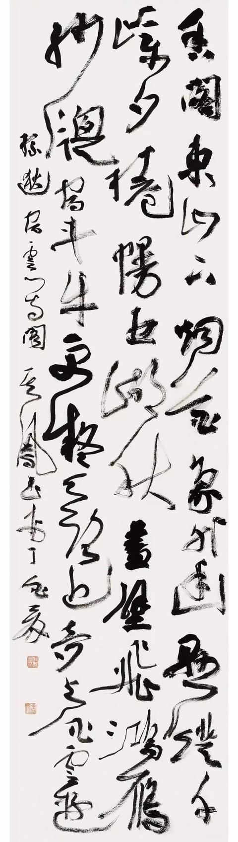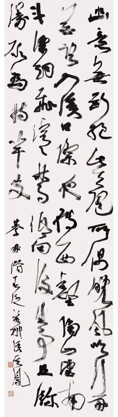 其凤在研究书史时发现,汉末、魏晋南北朝、唐代乃至北宋书法家们的取法渠道有三:一通向古人,二通向心灵,三通向造化。南宋尤其是元代赵孟頫之后,人们囿于古法,拘于心智,不再从大自然中摄取灵感,致使天地氤氲的万千气象在笔墨之间流失殆尽,有鉴于此,其凤重提“书法当师造化”这一主张,意欲将这中断近千年的灵脉续上,让自己的书法,回归自然。由此他有意识地在表现力最强的草书创作上设立了两个通道,以与自然对接:一是高音系列;二是云烟气象。其草书《王维山居秋暝》八尺竖幅,即为其高音系列的代表作。在书写这件作品时,他将在大自然中捕捉到的尖锐爽利的感觉、细劲挺拔的长线短线、跌宕峭厉、迅疾转换的节奏,这些完全可以看做高音的元素提炼出来,将其转化为书法的线条,从而组成了这幅既刚健热烈又灵动潇洒,蕴含着对宇宙生命律动的感悟,迸发出高亢激越、催人向上节奏感的草书作品。