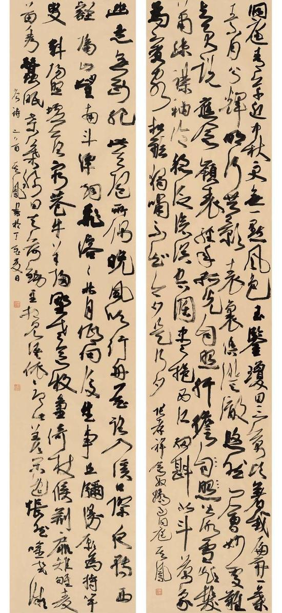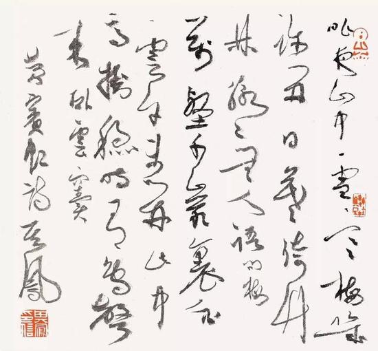 在临、创实践中,他不断地强化这两极式训练,譬如在驾驭小楷与狂草这一“对立元”上,写小楷,在那些极为短小往往未及展开就已结束的点画里,他要求聚焦精微,起、行、收三个阶段必须交代得动作沉稳、轨迹清楚,线条优雅生动,用以展示理性,彰显传统笔法的功底。二是在草书尤其是在狂草等方面,“飞流直下三千尺”、“大风吹倒三山去”,天马行空,激情澎湃,敢于探索,敢于出新,用以张扬自己狂放不羁的性灵。同时又不断地使“对立元”内的两极互相渗透,相互补充,相互调剂,相互糅合,在写小楷追求精美之时不失性灵,在写狂草追求天马行空、狂放跌宕状态中要有能力对激情难抑的动作加以操控。做到开合有致,虚实得宜,疏密得当,动静相生,枯润相映,达到对立两极的辩证统一,形成自己清新雄健,飘逸多姿,富文气,功性两具的艺术风格。在中国艺术里,对宇宙生命状态的揭示与表现,是一个永恒的主题。宇宙万物的律动与万千气象是中国书法线条最最重要的表达内容。