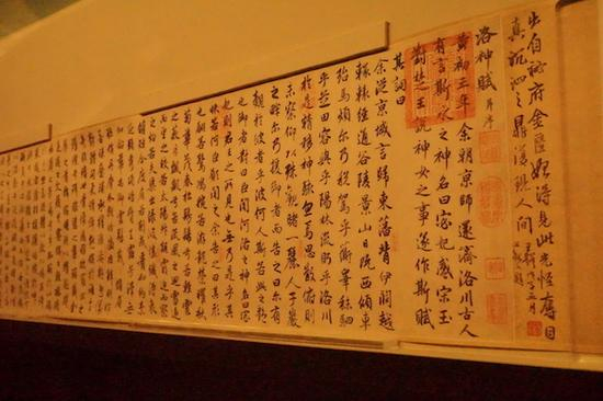 此次展出赵孟頫的主要的书法作品有行书《秋兴诗》卷、行书《归去来辞》卷、行书《洛神赋卷》楷书《无逸篇卷》;绘画作品有《秋郊饮马图》卷、《水村图》卷、《红衣罗汉图》卷等。