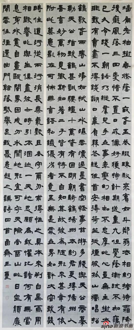 第四,在作品呈现方式上,我分别采用了中堂,两条屏,三条屏,三种形式,这样的三种形式作为一个整体来呈现,也会比较和谐。纸张和墨作为书写材料也很重要,篆书和隶书我采用了色纸,颜色是自己做出来,经过特殊处理,篆书的颜色偏于高古,隶书的颜色偏于淡雅,行书则使用生宣白纸,因为生宣简约大方,也能够体现书写的笔情墨趣。通过纸张材料与作品形式,分别营造出三种不同的审美氛围,会使三位一体的作品更加有感染力。