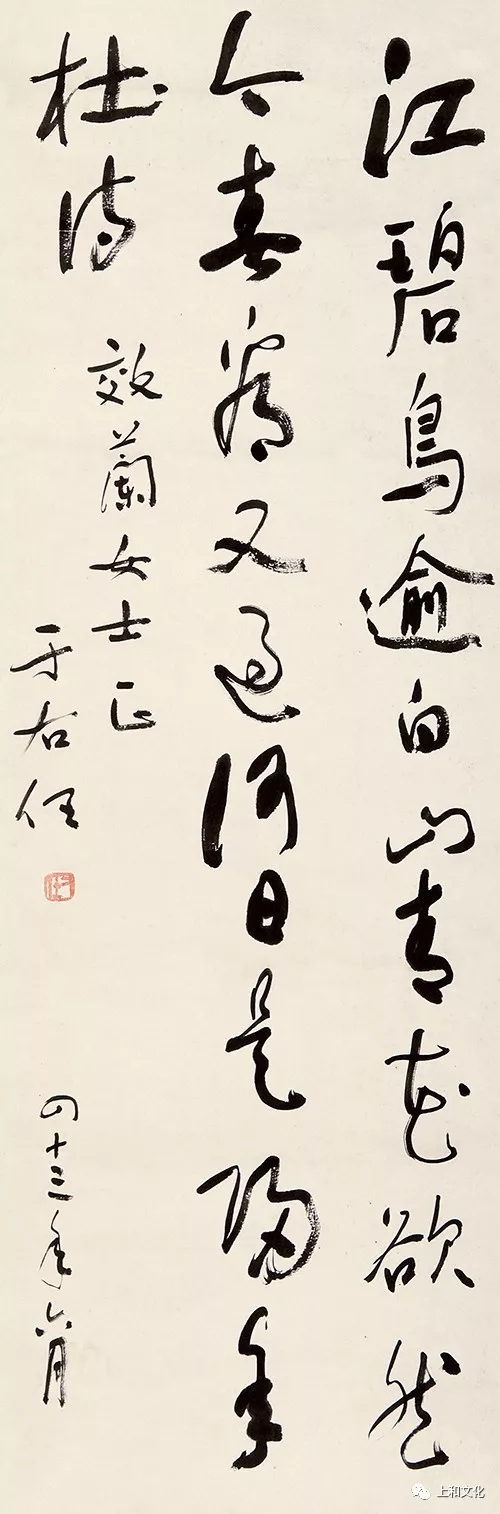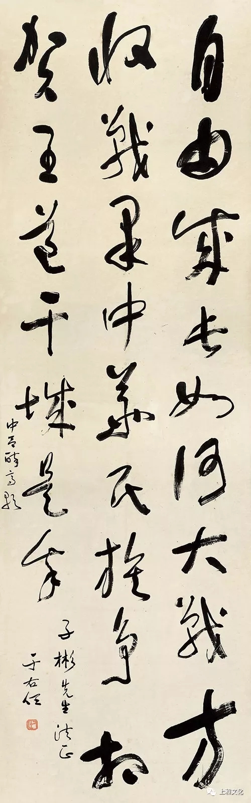 款识: 横扫千军不见大敌, 抗怀往古与为同俦。行洲先生, 于右任。