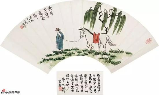 丰一吟题边跋: 白居易诗中有“浅草才能没马蹄”句,先父丰子恺却以“绿杨芳草送客归”配上同一画面,有异曲同工之妙。丰一吟敬题,甲午春。钤印:丰一吟