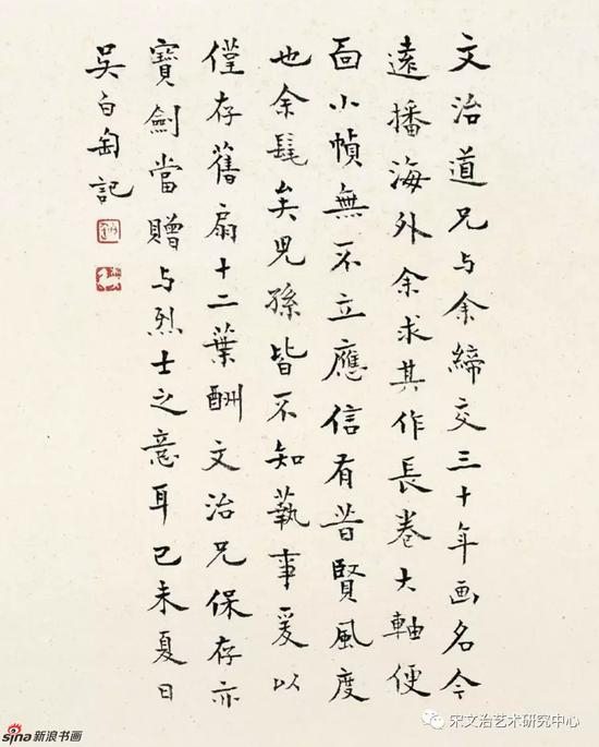 吴白匋(1906—1992),祖籍安徽歙县,出生于山东济南,后久居扬州,故先生说一口地道的扬州话, 让人误以为他是扬州人。 其年轻时就读于南京 金陵大学, 师从胡小石、黄侃等大师, 在文化领域有极高的造诣。1953年起 历任江苏省戏曲审定组组长、省文化局副局长等职。 他对昆曲、京剧、古代 书画鉴定研究颇深, 是一位学者型领导,也是一位著名的书画收藏大家。 我 父亲宋文治早在 20世纪50年代初在无锡与吴白匋先生认识,共同的喜好(昆曲、收藏书画、美食)让他们成为知交。尤其是1957年父亲自安亭调到省国 画院工作之后,二人来往更是密切。