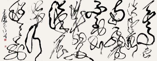 再后来,参观王衍成、李庚先生的作品,又产生了画“抽象画”的冲动。同时,我认为“画为心声”,笔墨不过是绘画工具,心,才是绘画本源。进入文明社会以来,人们的劳动工具不断创新,绘画工具又何尝不能创新?于是我又见碗用碗,见勺用勺,竟胡乱泼出一批“抽象画”,正所谓折花摘叶,皆为利器。。。。。。 在研习抽象艺术过程中,我读了康定斯基的《论艺术中的精神》,特别赞同他“具象是物质的真实,而抽象则是精神的真实”,“完全等同于音乐中的真实”,“物质只不过是蒙在精神表象上的一层迷雾”,“艺术家必须传达自己的思想感情,掌握外形绝非目的”等观点。但从作品与创作风格上讲,对我影响更大的是波洛克、弗朗兹·克兰、德库宁、托姆布雷等。弗朗兹。克兰画面中的空白与黑色笔触及飞白、徐、疾、通、滞、进、退、转、折等等,与中国的书法可谓不谋而合;托姆布雷也是从绘画与书写融合的角度提供了一个对现代艺术的理解方式。当然,对美术史、对梁楷、青藤、八大、齐白石以及赵无极、朱德群等,我也废寝忘食的进行了“恶补”。