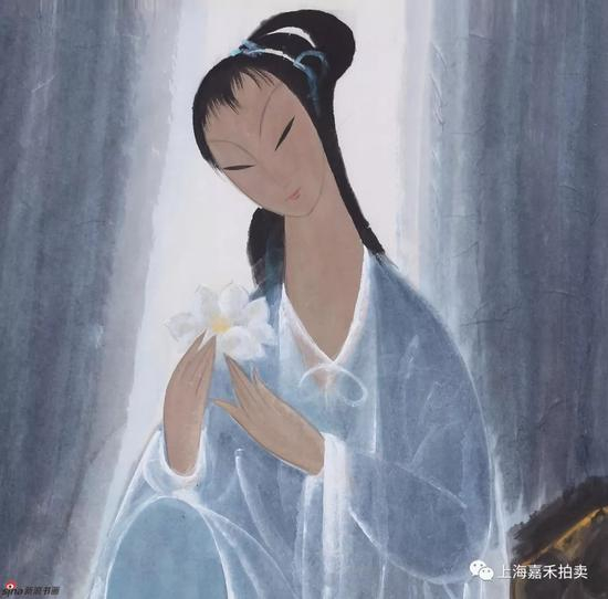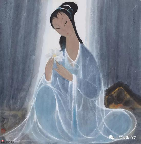 该幅作品在表现手法和绘画样式上单纯、简洁,用较少的笔墨,表达了更为丰富的精神内涵。画面上身着蓝衣的仕女手捧白荷,身披白纱,飘柔流畅的线条与温宛和谐的色彩有机的融合在一起。