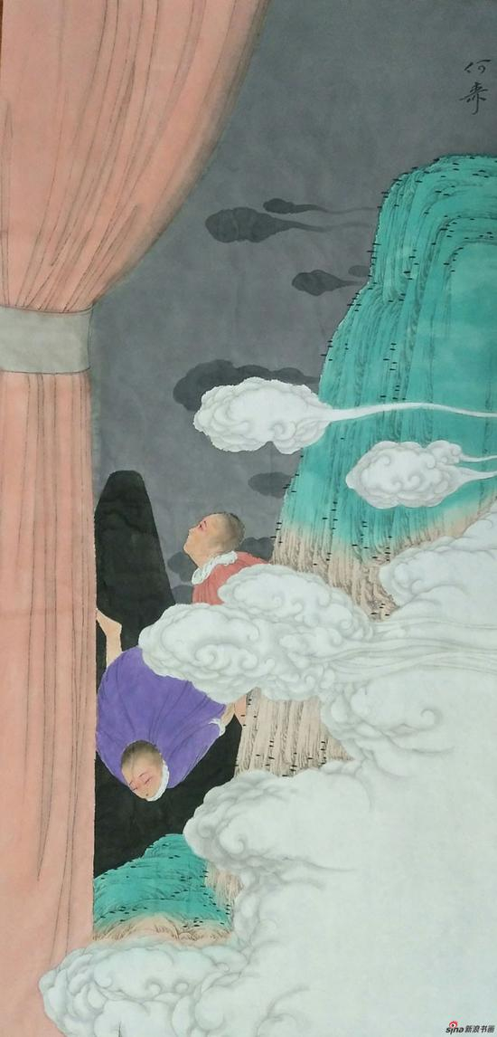 超现实主义绘画的表现形式是反传统,同时又强调多重形式的组合,打破了原有以写实为主的造型模式,通过对形体夸张、变形,表达出一种错觉、神秘、怪诞和梦幻的想象空间。在“天界系列”绘画中把本不该联系在一起的事物混合在一个空间里,利用透视、形状、色彩、光影等表现手法,展现出一幅幅反常、迷惑、荒诞和灵异的画面,让观者在非理性的、梦幻的视觉中体验超现实的世界。主要表现在三个方面:一是图式的多样性,无论是“游园惊梦”,还是“旧梦迷痕”在构图取向上已不再是中国画中传统的构图模式,融合了西画构图、插画、装饰画等,以及蒙太奇手法和摄影技巧,让图式中的各种物象叠加、拼凑、改组、嫁接,形成错置的魔幻。二是色彩的多变性,在“游园惊梦”与“旧梦迷痕”中,色彩的冷暖明暗显得非常分明,打破传统色彩的程式性和规律性,使冷暖明暗变得融合而多变,强化了画面的动感,通过色彩的变化和对比,来表现压抑和兴奋、忧伤和喜悦、迷惑和醒悟、低落和高涨、豪放和婉约、朦胧和清晰、僵化和灵活等的审美情趣,丰富了画面的表现力和感染力。三是画法的多重性,我们从“天界系列”的绘画作品中不难看出,其绘画的根基是中国画,有中国画的线条和水墨韵味;但更多的是融入了西方画法,以及日本动漫和欧美插图的创作理念。在创作上以自身的感受为基础,凭着对物象的感觉和心理冲动来布局谋划,调动对称、错位、平行、俯视、仰视等视觉错差,再现梦幻般的现代情调。