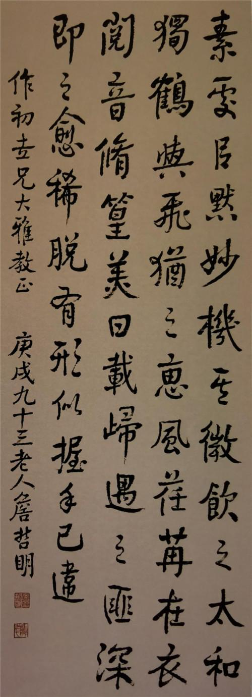 与很多名门世子一样,哲明老先生自幼苦读经史、浸淫诗词,于最能体现中华民族精神的书法艺术更是情有独钟。哲明先生最擅长的书体是行楷、次为篆隶,草书较少见。他偏嗜更适宜抒情的书体,因为这样更能发抒他典雅遒逸的审美理想。潘天寿先生曾言:“艺术不是素材的简单再现,而是通过艺人之思想、学养,天才与技法之艺术表现。不然,何贵有艺术。”赏鉴哲明老先生的书法,是不难感受到作者高尚的人品、博大的心胸、深厚的涵养、纵横的才气和精湛的功力的。