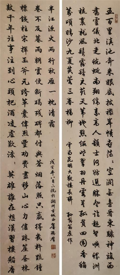 从詹老的行书考察,除固有逸少底蕴之外,更多欧阳率更的瘦劲笔势。从《刘克庄清平乐词》、《饶平县拓林白雀寺殿前长联》行书条幅看皆为典范;《岳飞满江红词》四屏条幅、《绿贾岛寄韩潮州愈七律》条幅,笔势凝重,锋芒出入有迹象,则除有率更《千字文》及《梦奠帖》意韵之外又有鲁公《争座位》的气数。对于鲁公书法,学者一贯认为是“真不如草,草不如稿”,《争座位》帖代有褒贬。宋米芾云:“《争座位帖》有篆籀气,为颜书第一,字相连属诡异飞动得于意外。”明王世贞亦云:“无一笔不作晋法,所谓无意而又从容中道者也。”但清包世臣却说:“唯《急座位》至易滑手,一入方便门,难为出路。”可见詹老对这些理论甚为明了,对《争座位》只取其意,不涉其门。詹老在己巳年冬月写的李白五律《送友人》行书条幅、节录《苏轼‘韩文公庙碑’》行书条幅和《范成大喜诗示桂人》条幅、《张丛七星山诗》条幅则又在苏、米笔意中多了几分文衡山清秀的意韵。衡山早年学苏,后法鲁公,多取宋元人笔意,并在子昂书中多得力,故能婉丽劲秀。詹老行笔却更有胜意,能于婉丽中截铁斩钉,自成家数。