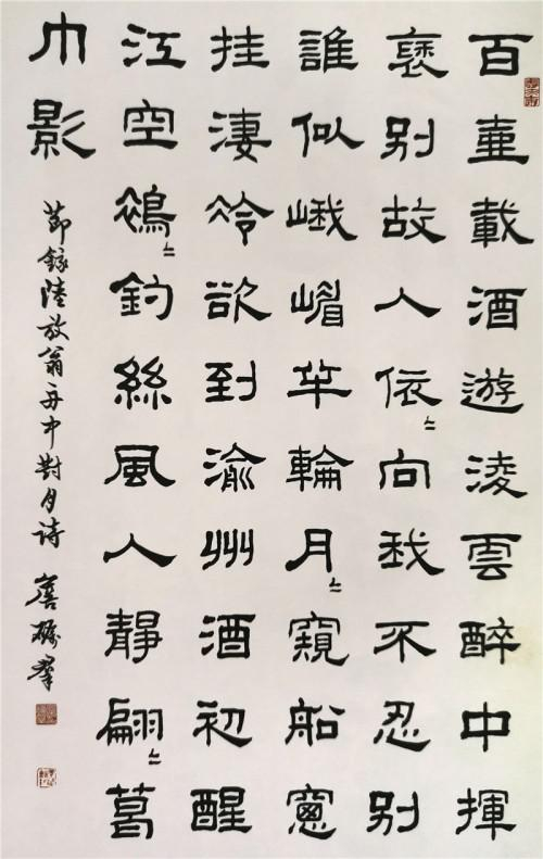 詹老的隶书,笔者只见过四五件。从辛未夏月书写的《君德明明》诗句条幅看,其下笔转接多取裁《汉鲁相乙瑛碑》,优游宽博,清腴精整,实具有士大夫之格。前人称褚河南、颜鲁公学书,多得《乙瑛》之妙。可见高人见识略同。辛未春月书《陆放翁诗句》条幅及近书该诗句团扇,面目近《汉史晨飨孔庙碑》,笔意修洁,均齐方正。笔法则又近《华山庙碑》,古意今情,奔赴腕下,承接严密,柔而有刚。从詹老的隶书作品中,更能感受到“平和简静、温淳典雅”的状态了,而这种状态则是阴阳和合的一种状态。如《老子》四十章云:“道生一、一生二、二生三、三生万物。万物负阴而抱阳,冲气以为和。”这种谐和之气,就是阴阳两气相交激荡而形成的新的和谐体。在大自然来说,清轻之气即阳气,重浊之气即阴气。在书法上说,“平和简静、温淳典雅”是阴阳偏激之气经过长期的涌摇激荡之后产生出来的一种均调状态,是高层次的产物 。