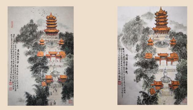三是强烈对比的内容安排。一方面,为反映昔日武汉市、黄鹤楼之壮美景观,他创作了《江山美如画》《黄鹤楼揽胜》《送别孟浩然之广陵》《李白诗意图》等绘画和书写了崔颢、李白、王维、毛泽东等历史名人赞美黄鹤楼的《江夏送友人》《送康太守》《鹦鹉洲送王九》《菩萨蛮 黄鹤楼》等诗文。另一方面,为表现疫情灾难后的黄鹤楼窘境,他特别写意了《黄鹤楼戴口罩》《武汉之殇》《黄鹤楼之殇》等大幅作品,使参观者在前欣喜、后悲哀的强烈情感起伏冲击之下,产生撼人心痛、催人泪下的艺术感染力。