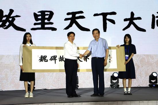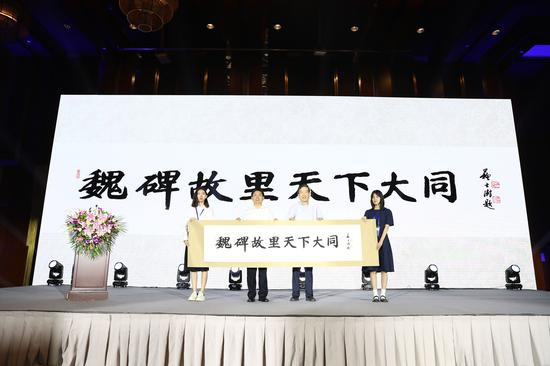 在现场的展示与赠送环节,中国书法家协会主席苏士澍向大同市委书记张吉福赠送为双年展书写的“魏碑故里、天下大同”八个大字,这八个刚劲有力的大字,既点明了大同作为魏碑故里灿烂辉煌的书法文化,同时也阐释了中华传统优秀文化为构建人类命运共同体所发挥的作用。