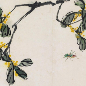 这幅虫草图在齐白石“衰年变法”的画作中,以桂花为题材的作品并不多见。金桂飘香,蝈蝈游离花枝下,层侧分明,视觉舒朗。尤其画中蝈蝈,由齐白石独创的干笔法画出,筋骨可见,既形象又神似。齐白石寓情于景,笔笔写出,无不体现其独运匠心,堪称文人画“逸品”。此外,齐白石的花卉草虫是一丝不苟的,尤其草虫,洋溢着自然界生机勃勃的气息,尤其在刻画完美却未完成的图稿中,那些没有添景的空白部分可以引发人们的多种想象。齐白石在小小的方尺之间绘制了蝴蝶,蝴蝶的翅膀画得蓬松通透,可以想象,它的周围是一个甜蜜的世界。其实,齐白石在60岁之后陆续画了一批工笔草虫待以后补景,通常会将之与阔笔大写意花卉合于一图,防止老年时不能作工细的草虫。其中,除了此幅蝴蝶,还有一幅蝈蝈也未做写意花卉,均乃是齐家留存下来,为后代子弟学习绘画的资料所用,其价值尤为珍贵。