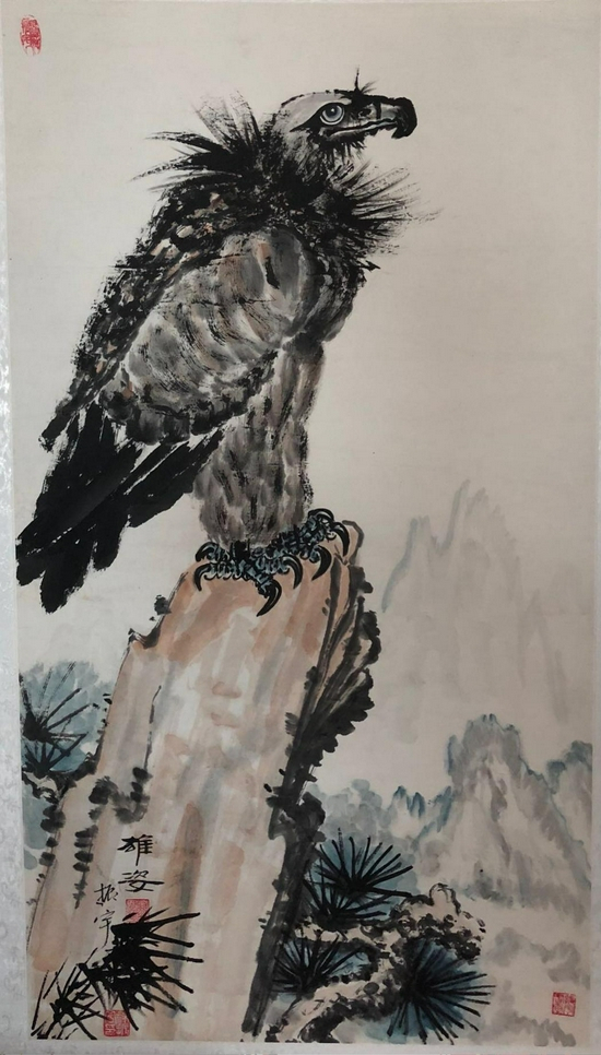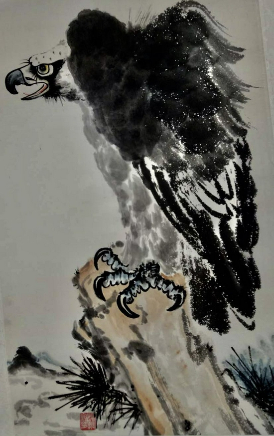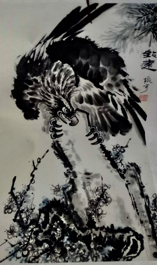 以擅长画飞鹰为一绝而被誉为“鹰圣”。以鹰姿表达人生情怀,以鹰神表达爱国热情,书画风格在业界叫绝!其作品1989年《百鹰图》及1996年《百米长卷百鹰图》在国内首创问世后,先后在中国美术馆和台湾等地展出,受到《人民日报》、《中国日报》等国内外26家报刊及电台、电视台、中外书画界极大关注和好评,指出共同点:在中国首创独具艺术风格的《百鹰图》,前无古人,独创一派。