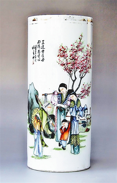 《三字经》中有“昔孟母,择邻处”的传诵名句,说的是在战国时,孟子的母亲为了让孟子有个好的学习环境,曾三次搬迁自己的住处。正因为孟母对儿子的悉心教育,才使孟子成为中兴儒学的“亚圣”。这个粉彩帽筒就绘有孟母三迁故事图:孟母穿着布衣,双手微举,嘴唇微动,似乎在向前方老婆婆打听附近的情况。旁边的侍女用竹竿挑着行李,静静地站立。前方的老婆婆头发花白,肩扛竹竿,身背竹篓,脊背弯曲,似乎在回答孟母的问题。小孟子一手拉着母亲的衣角,一手放在嘴角,像在思考着什么。背景是一棵开满红花的树,亭亭玉立。此帽筒高28厘米,口径12厘米,釉面滋润,画工精细,色彩舒雅。