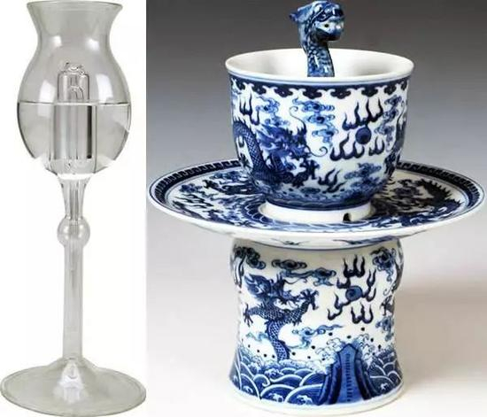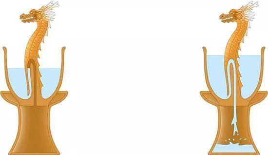 九龙杯在白腻的瓷面上,有青花钴料工笔描绘的人条姿态各片的五爪龙,连同杯中的一条雕刻的龙,共有九条五爪龙,寓示皇帝“九五之尊”的威严。更神秘的是,杯中央的瓷龙颈部有一黑色的圆点,当酒水低于圆点时,一切正常,当水面超过黑点时,杯中酒水很快就流出杯外。这是因为瓷龙一侧与杯底衔接处有一约3毫米见方的小孔,在杯外底中心也有一直径约3毫米的小孔,当往杯中注水超过黑点时,水便从杯内底小孔进去,又顺着外底的小孔流了出去,这其实就是虹吸现象的作用。究其原因是,液体从较高处通过一条拱起弯管,先向上再向下流到较低之处,其因为弯管要呈倒U字形且一端较长,使用时管内必须先充满液体。公道杯里外的两孔之间曲弯管相迮,外部一端较内端长,而瓷龙所标黑色圆点的位置即弯管最上端的部分。当杯中水低于或平齐于黑点时,水不能漫过弯管而泄流,当水超过黑点时,水面高出弯管产生压力,于是通过虹吸而使水顺右弯管流到杯外直至流净。是一件集工艺性、知识性、趣味性和审美性于一器、欣赏与收藏并重的特色瓷。