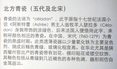 “竹节颈双凤首流剔刻写意牡丹仿皮革执青瓷壶”(见图1-图20、),陈列于吉美中国陶瓷馆北方青瓷展台最显要位置(见图22、23、)。从该馆的“北方青瓷”(见图21、)说明可知该馆把这些展品,包括该“竹节颈双凤首流剔刻写意牡丹仿皮革执青瓷壶”,全部认定为“五代及北宋青瓷”。