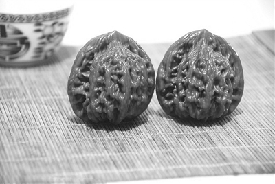 核桃只是文玩行当里的一个小门类,但要挑选一对文玩核桃可是不容易的。要从成百上千的核桃中挑出两个纹理相似、大小一致的核桃凑成对儿,再加上多年的精心把玩,核桃的颜色才能由浅变深,最终变成老红色,更显珍贵。