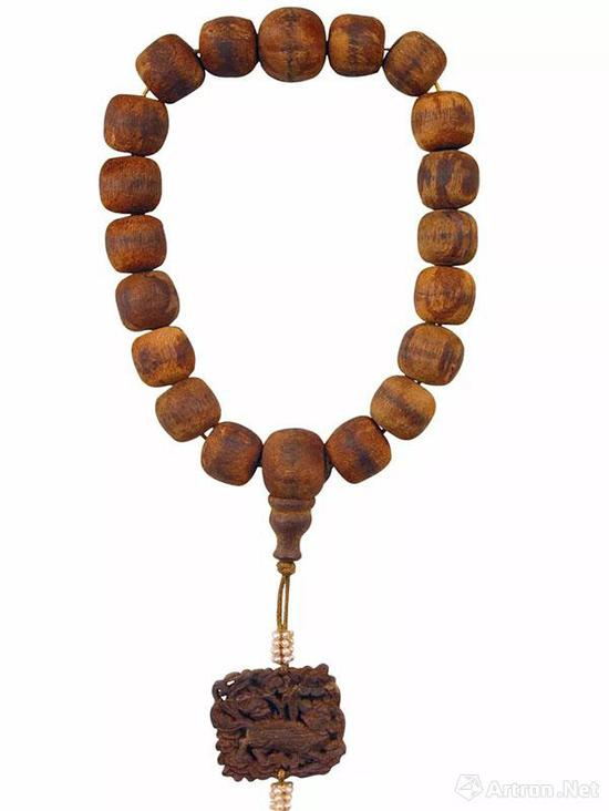 伽楠手串。长17厘米,共计20颗珠。为北京故宫博物院调拨。其中母珠2颗,子珠18颗,雕饰有二狮戏云纹小牌坠饰1个,坠饰上有4组白色珍珠记子留