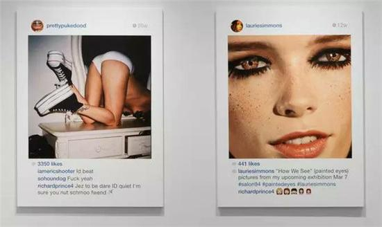 今年,知名艺术家Richard Prince在佛瑞兹艺术博览会上展出了他的Instagram绘画作品。他在模特、名人和艺术家上传在Instagram的照片下评论,并将带有自己评 论的页面进行截图,再照着这张照片,将其画在画布上。去年秋天,这些作品在Gagosian画廊里展览,每幅作品标价9万美元。