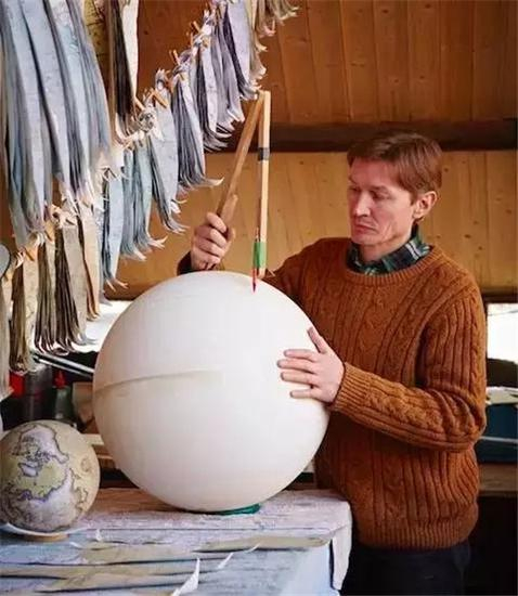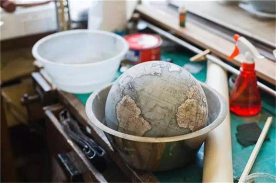 在无数次失败后,终于研究出一套制作方法,经过绘图、拼贴、轴承制作多个工序,历时18个月造出一个兼具实用与艺术性的地球仪。