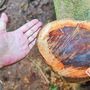 杨婷婷接到电话赶到现场时,才发现除被盗走的一棵外,还有一棵更大的降香黄檀主干上,相距40厘米的上下两端,还留下了分别被锯子锯入1/3和1/4深的两道锯痕。经安全保卫组主管岩总带人前来勘查后,发现不仅降香黄檀被盗,摆放在附近的一辆推车也不见踪影。泥泞的地上留有两道深深的车轮印,岩总带领保安人员沿着车轮印一路经过百花园往西,追踪至环绕植物园的罗梭江边时,发现林中还有拖运木料留下的痕迹,随后又在江对岸城子寨旁边停放的两条小船上,发现了蹭下来的降香黄檀树皮和树叶。
