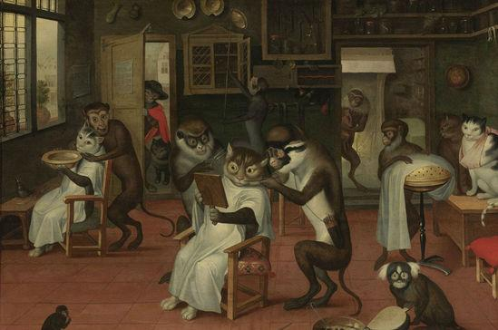 亚 伯拉罕·丹尼尔斯(Abraham Teniers) 是比利时著名Teniers艺术家族中的一员。他的父亲、兄弟、以及他的儿子David Teniers都是17世纪的艺术大家。(图为“Barbershop with Monkeys and Cats”,理发店的猴子和猫)