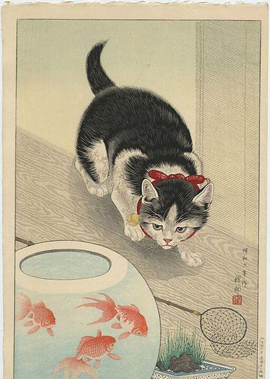 小 原古邨(Ohara Koson 1877-1945),日本版画家,从没画过美人画,他的目光越过热腾腾的人世生活,望向动物界,大多都是在描绘各种珍稀动物,即使画了植物,也仅为衬托 动物而画。其作品描绘逼真,色彩柔和流畅,是装饰感很强的版画作品。(图为“Cat and Bowl of Goldfish”,猫和金鱼)