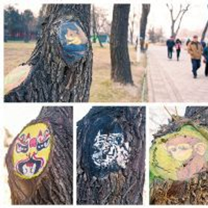1月3日,太原市迎泽公园藏经阁附近,树洞、树疤上绘满了各式各样的涂鸦,作品有京剧脸谱、国宝熊猫、卡通人物汤姆和杰瑞,甚至还有莫奈名作日出印象的模仿作等。