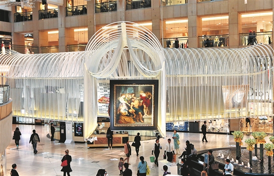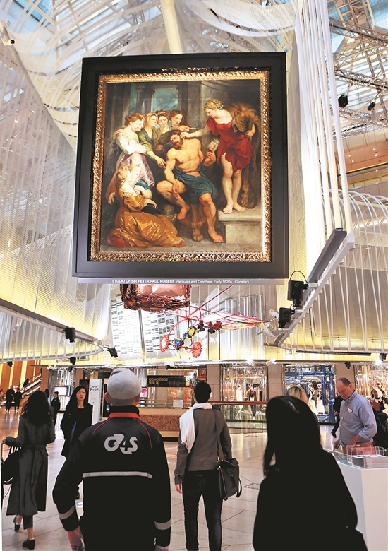 为拓宽公众的艺术视野,香港中环置地广场3月21日至4月4日为观众带来一场别开生面的艺术创意之旅——空中艺术展。展览以悬挂于空中的三重视角方式,展出14件博物馆级艺术品,总值超过1亿港币。图为人们从艺术大师彼得·保罗·鲁本斯的名作下经过。 (新华)