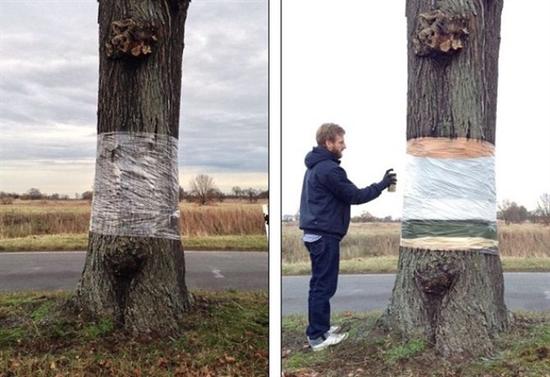 在公路旁找到合适的大树之后,Daniel Siering和Mario Schuster便使用塑料布缠裹树干,而后用喷漆在塑料布上喷绘出周围的景观,达到让被塑料布缠裹的树干隐形的效果,进而让大树“飘浮”在半空。