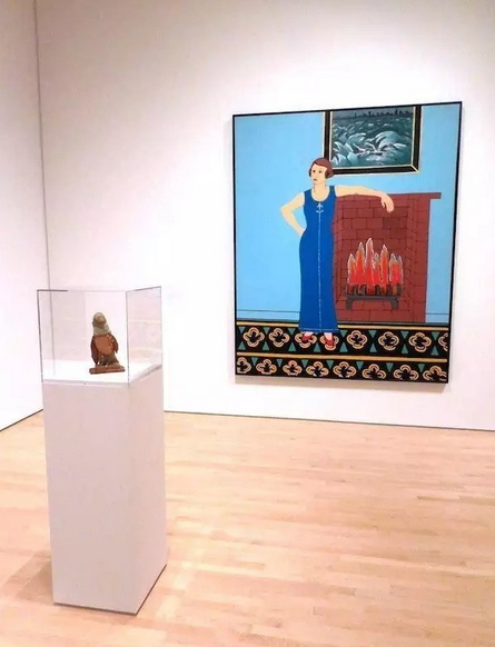 当 然,你还是会在旧金山的“异类”处发现它迷人之处。例如,在一个专门展示加州北部地区艺术的展区内,展出了湾区具象派画家琼·布朗(Joan Brown,1938-1990)一幅怪异又可爱的布面油画。 前景中的艺术家优雅端庄地站立着,而悬挂在她后方的画却呈现了她游向阿卡特茲(Alcatraz)岛时波涛汹涌的场景。