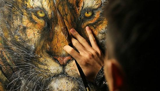 和西方传统的涂鸦不同,英杰的作品有着浓郁的中国国画风。他喜欢将喷漆泼贱在一面墙或者是巨幅画布上,然后再用细笔勾勒。他特别喜欢画动物,尽管他属羊,但是他更喜欢画老虎,狮子,猎豹,老鹰和毒蛇。这些动物的共同点是,它们都是捕猎者,英杰喜欢它们猛、狠、快、准的敏捷动作,以及凌厉的眼神。