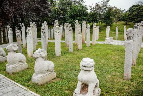 陕西历史博物馆大院里的拴马桩和石马群。